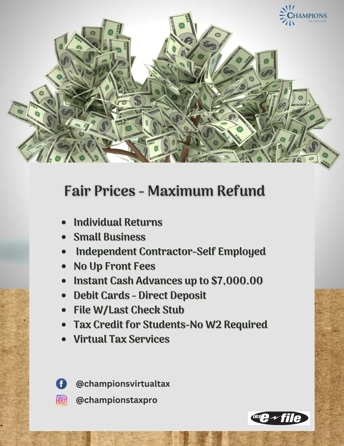 Champions does my taxes every year, it’s always a smooth process and she has great customer service.👍